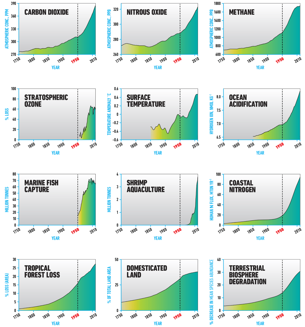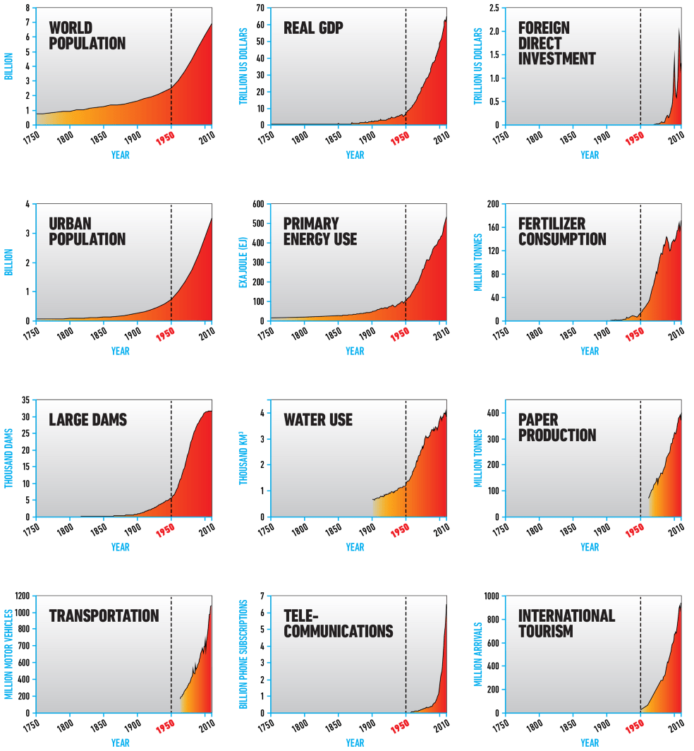 A report named Great Acceleration was originally published in 2004 to show socio-economic and Earth System trends from 1750 to 2000. In a 2015 report named The Trajectory of the Anthropocene: The Great Acceleration , graphs were updated to 2010.