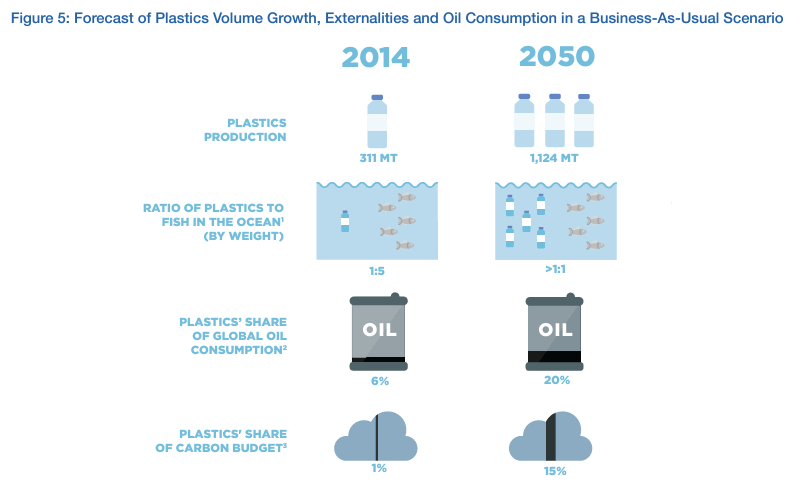 Below is a diagram found on page 14 of the above-mentioned report, which gives us a schematic and straightforward description of the expected trends in plastics production in a business-as-usual scenario: